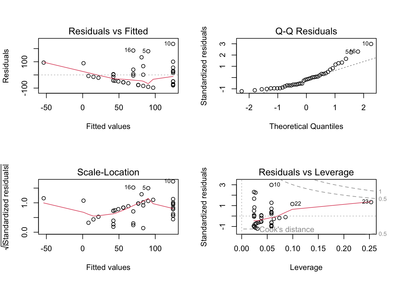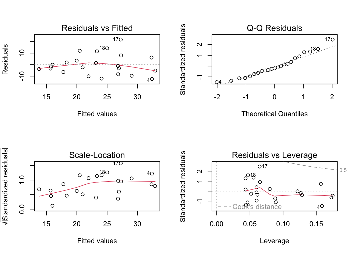 )par(mfrow = c(2, 2)) # displaying diagnostic plots in 2x2 grid