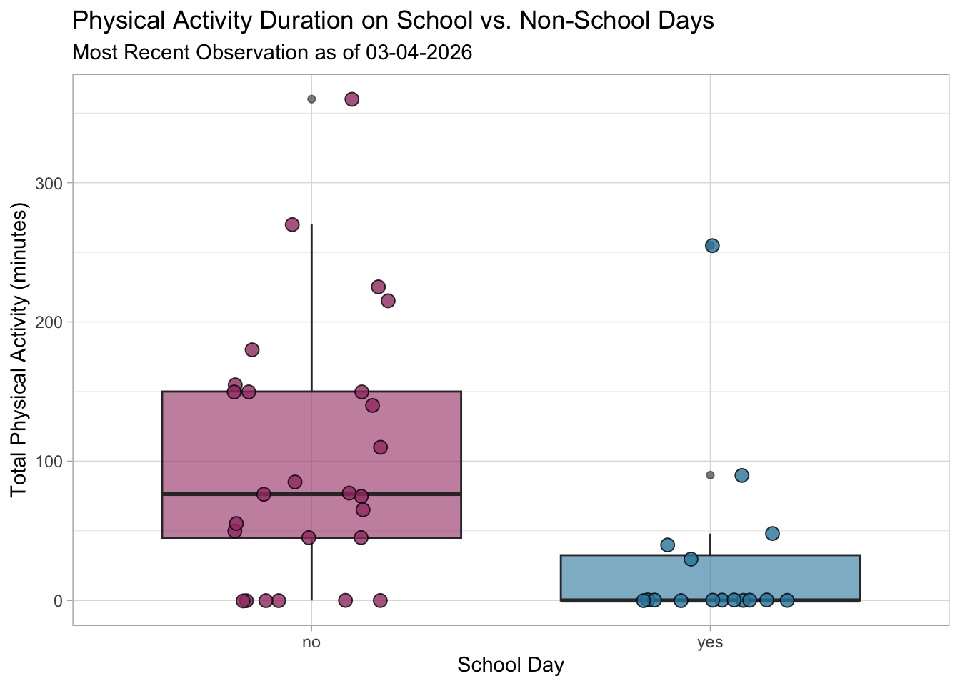 Figure 1: Comparison of Activity Duration by School Day Status. This boxplot compares physical activity duration (minutes) between days with on-campus classes (“yes”) and those without (“no”), where the teal and red boxes represent the interquartile range and the central horizontal line marks the median. Circular points represent individual days of activity in their respective categories with coresponding colors. The categorical predictor, School Day (x-axis), is plotted against the continuous response, Total Physical Activity (y-axis) in minutes, showing a clear divergence in habits. Non-school days maintain a substantially higher median (approx. 76.5 min) compared to school days (0 min). Statistically, the narrow distribution for on-campus days indicates that academic scheduling consistently restricts physical movement to a minimum, whereas non-school days means significant flexibility and peak activity duration.
