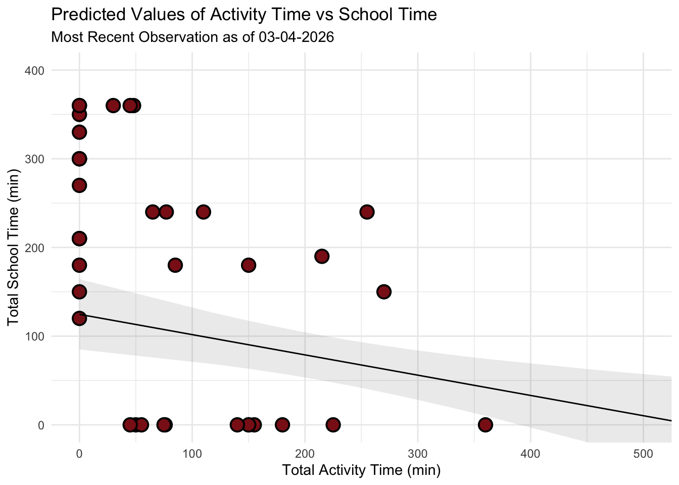 Figure 2: Linear Regression of School Time and Activity. This scatterplot and linear regression visualize the trade off between academic commitment and physical movement over a 42-day period, with red colored circular points representing individual daily observations of total school time and corresponding total activity time. The analysis utilizes Total School Time (x-axis, in minutes) as the predictor and Total Activity Time (y-axis, in minutes) as the response, featuring a solid black trend line for predicted values and a grey shaded “ribbon” representing the 95% confidence interval. The model reveals a statistically significant negative relationship (\(p = 0.009\)), where the downward slope quantifies a decrease of approximately 0.23 minutes of activity for every one-minute increase in school time, confirming that high-volume academic days act as the primary constraint on physical exercise.
