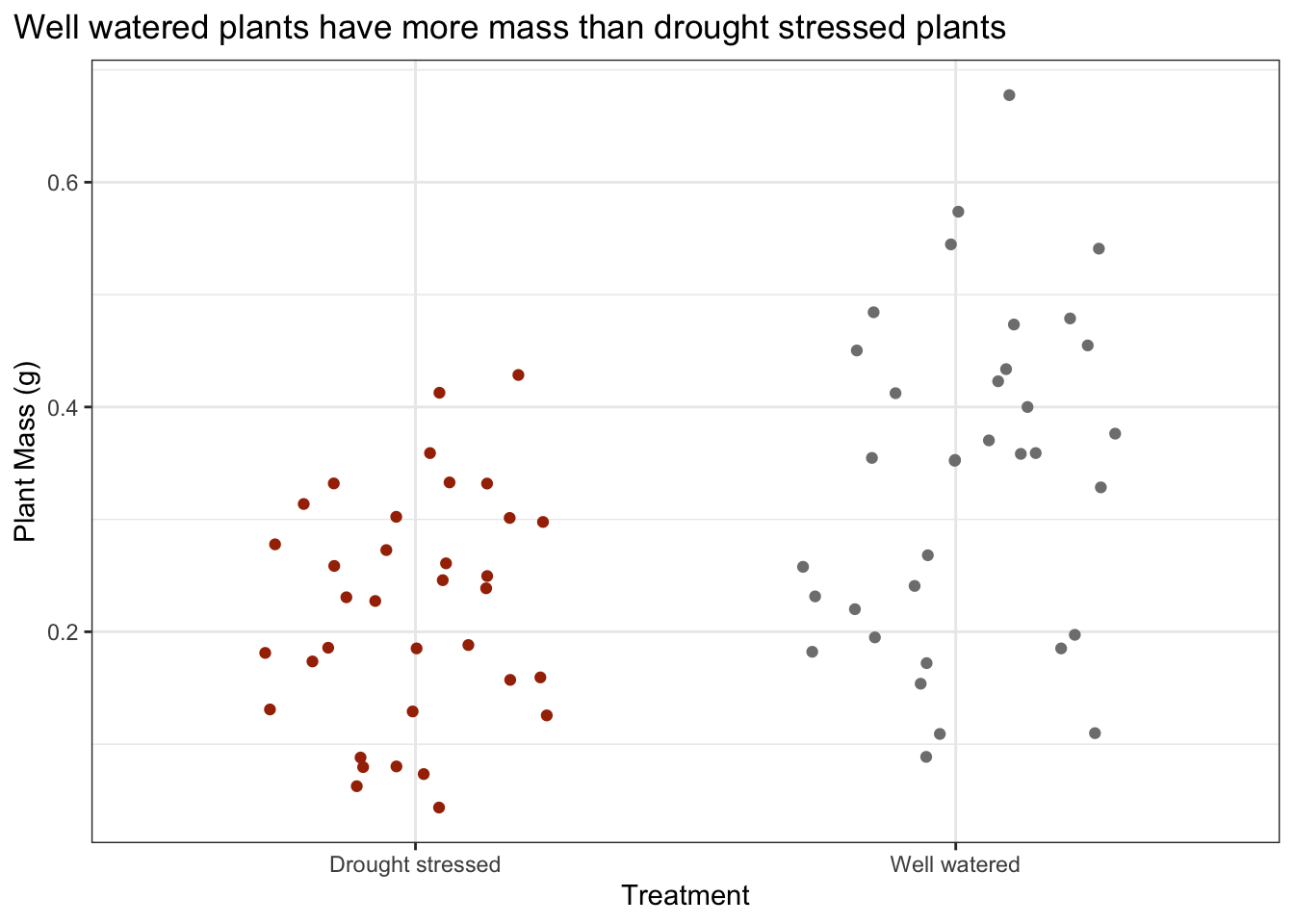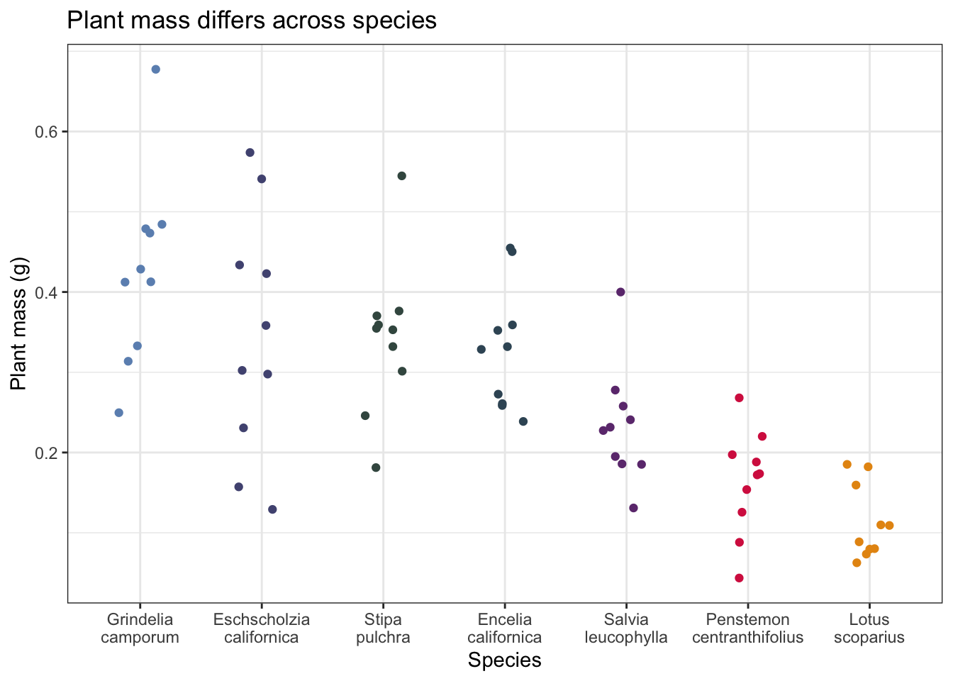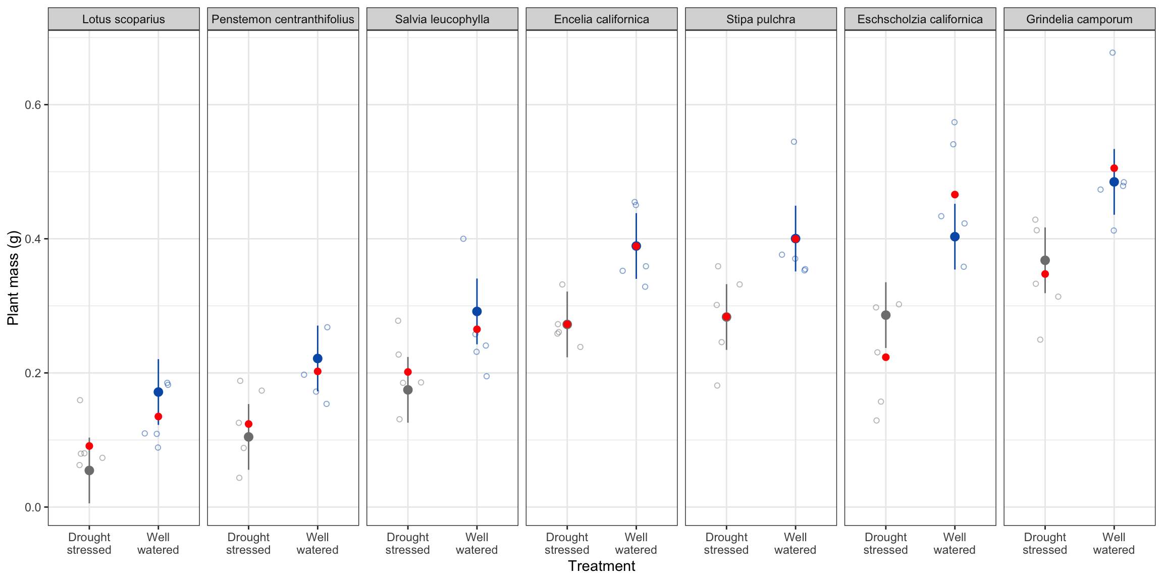 Figure 4. Plant mass (g) differs accross species and treatments. Open circles represent individuals in each treatment (red: drought stressed, blue: well watered). Panels depict different species. Opaque points represent model predictions for plant mass, and bars represemnt a 95% confidence intervals of model predictions. Data source: Valliere, Justin; Zhang, Jacqueline; Sharifi, M.; Rundel, Philip (2019). Data from: Can we condition native plants to increase drought tolerance and improve restoration success? [Dataset]. Dryad. https://doi.org/10.5061/dryad.v0861f7